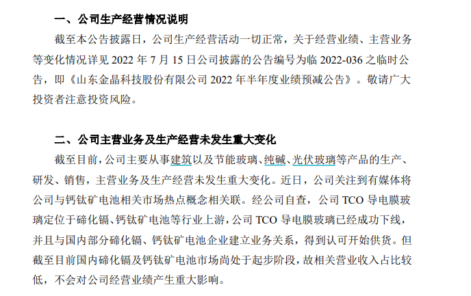 公司8月1日晚间发布提示性公告称,近日,公司关注到有媒体将公司与钙钛矿电池相关市场热点概念相关联。公司TCO导电膜玻璃与国内部分碲化镉、钙钛矿电池企业建立业务关系,开始供货。但金晶科技坦言,相关营收占比较低,不会对业绩产生重大影响。