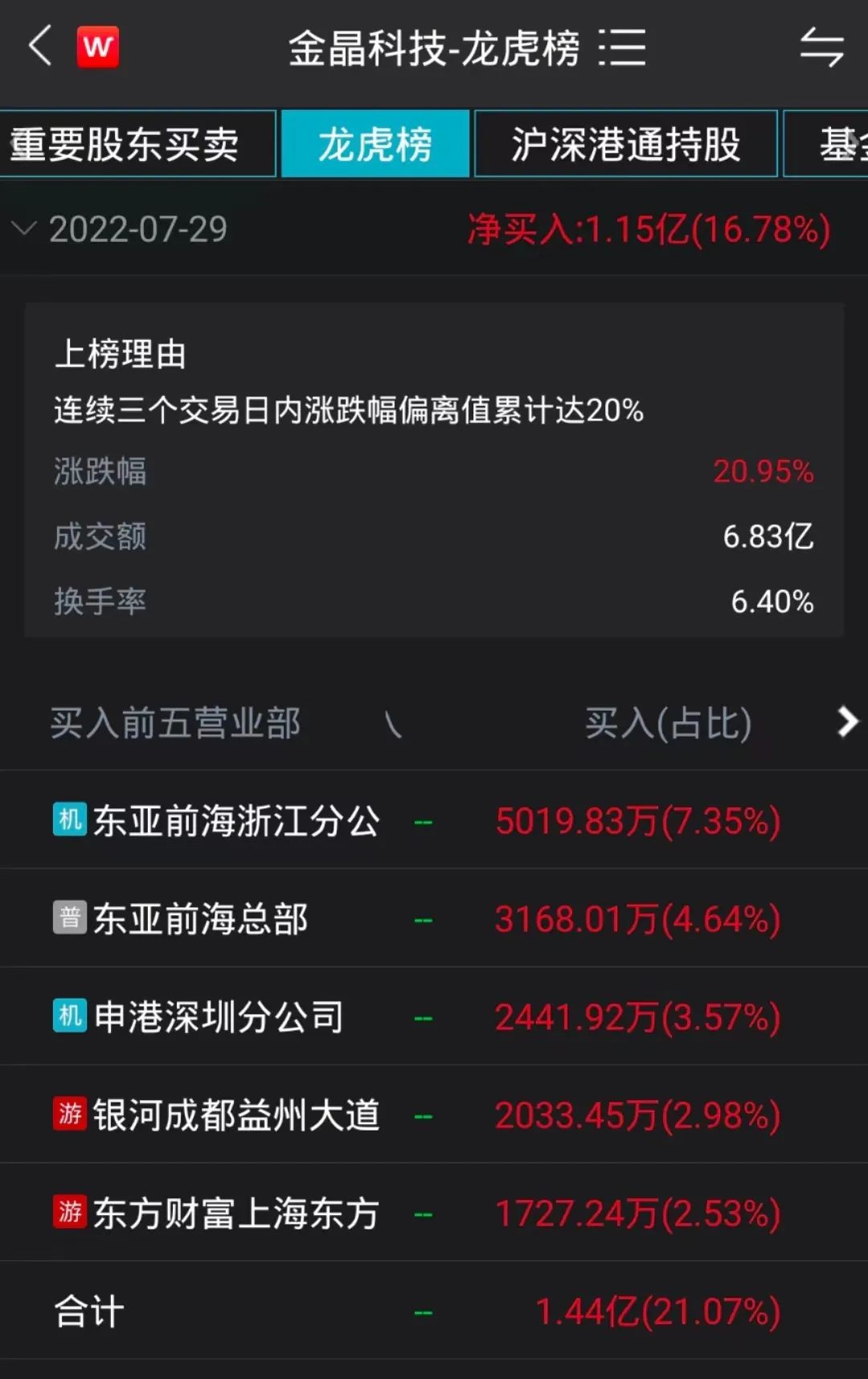 Wind数据显示,7月28日、7月29日、8月1日,公司股票三连板,股价累计上涨超32%。期间龙虎榜显示,东亚前海证券浙江分公司、申港证券深圳公司分别买入5019.83万元、2441.92万元。