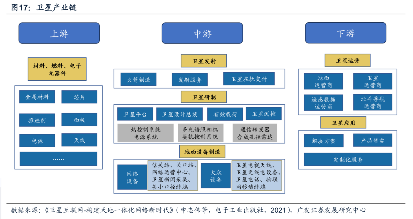 主要由卫星、火箭、飞船及探测器组成。当前我国卫星产业链从制造端到应用端(通信、导航、遥感)已逐步发展成型,中下游占据大部分市场规模,民营企业参与度较高。
