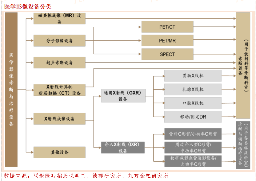 医疗器械可按照不同的功能和作用划分为医学影像设备、手术相关设备及体外诊断设备等。也可以按照不同目的,划分为诊断影像设备及治疗影像设备,其中前者又可以按照不同信号细分为磁共振成像(MR)设备、X射线计算机断层扫描成像(CT)设备、X射线成像(XR)设备、分子影像(MI)设备、超声(US)设备等;后者可以细分为数字减影血管造影设备(DSA)及定向放射设备(骨科C臂)等。