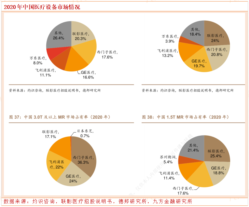 2)公司:随着公司技术突破和产品推陈出新,近年来市场份额快速提升,按2020年新增设备口径,公司在MRI、CT、PET-CT、PET-MR等领域增量市场份额均为第一,在高端领域如3.0TMRI、64排及以上CT等市场份额均为第四,新一代产品有望实现高端突破。
