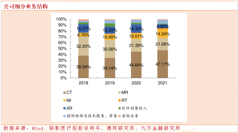 设备营收占比高,CT、MR收入占比近7成,MI、RT高速增长占比迅速提升。2018-2021年,公司主营收入以医学影像诊断设备及放射治疗设备销售为主,2021年医疗设备占总营收比重91.3%,为公司营业收入中的支柱性业务。