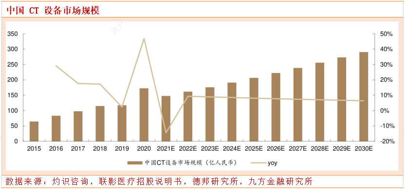 CT因扫描速度和成像清晰被广泛运用于众多疾病的检查筛查。2020年全球CT系统市场规模约135.3亿美元,灼识咨询预计2030年或将达到约215.4亿美元,10年CAGR为4.8%;全球维度来看,亚太地区CT配置提升仍有较大的空间,预计未来10年CAGR为6.5%,增速居全球各地区首位,2030年市场规模有望达到约98.7亿美元。
