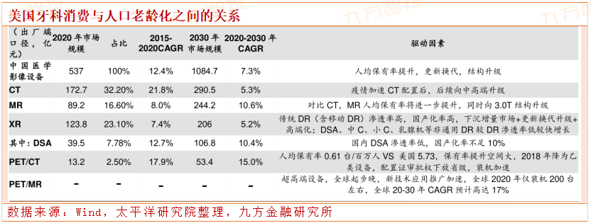 各细分设备发展阶段差异显著,我们复盘后续细分设备驱动因素,CT、MR、XR、超声占比超90%,技术发展及应用较早,在人均保有率提升基础上,更新换代+结构向高端升级为主要驱动力,此类设备预计20-30年CAGR在10%左右;