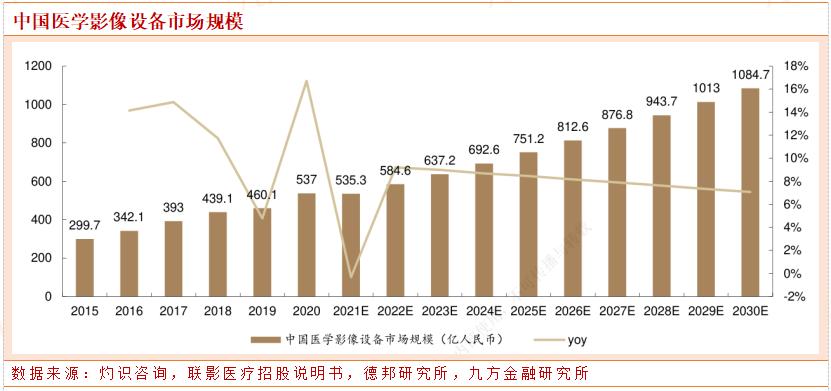 伴随着市场需求的不断增长和政策的积极扶持,据灼识咨询以出厂价口径计算,中国医学影像设备市场规模2020年已达到537亿元,未来十年预计以年均7.3%CAGR快速增长至2030年的1084.7亿元。