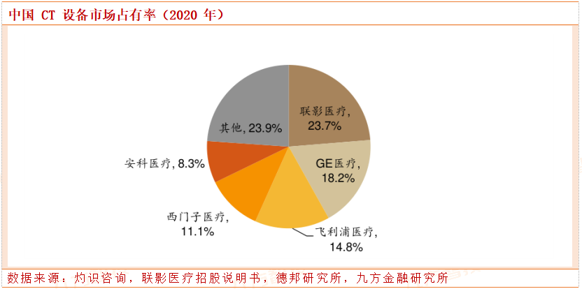 联影医疗是中国市场最大CT设备厂商。按照新增销售台数计,2020年联影医疗是中国市场最大的CT设备厂商。灼识咨询数据显示,中国64排以下CT国产化率已经达到65%,联影医疗作为国产CT品牌的龙头,以23.7%的市占率独占鳌头。