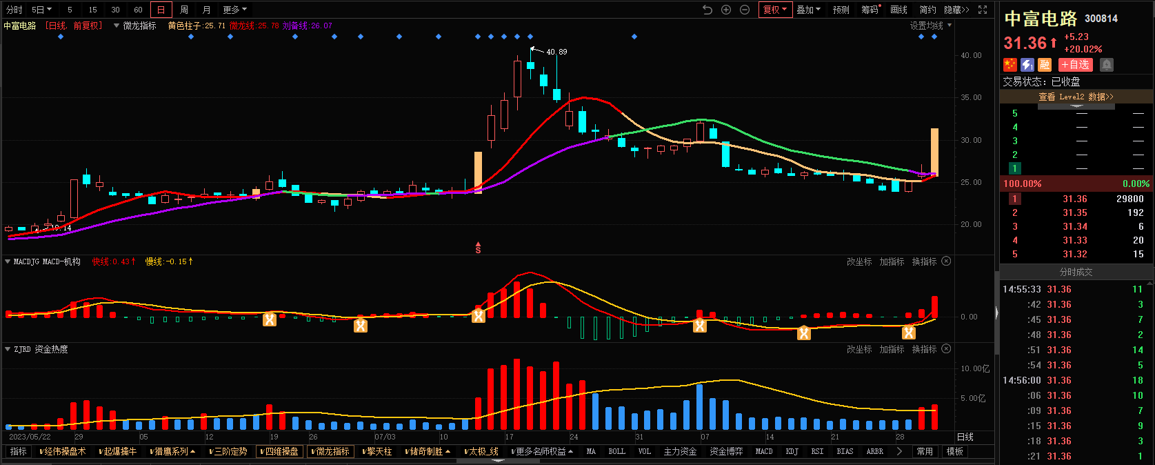 3)参考技术指标:中富电路-微龙指标-股价站上微龙线和刘备线