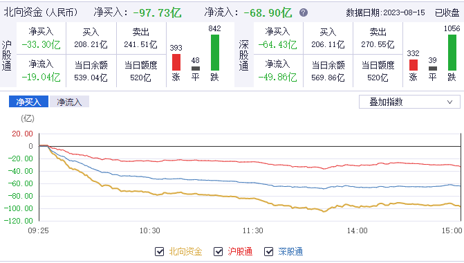 盘面上,SPD、供销社、证券、纺织服装等板块涨幅居前,中芯国际概念、传媒、TOPCON、贵金属等板块跌幅居前。同时,沪深两市总成交额7065亿,较上个交易日缩量354亿。而北上资金,则在今日净卖出97.73亿,呈现出加速流出态势。