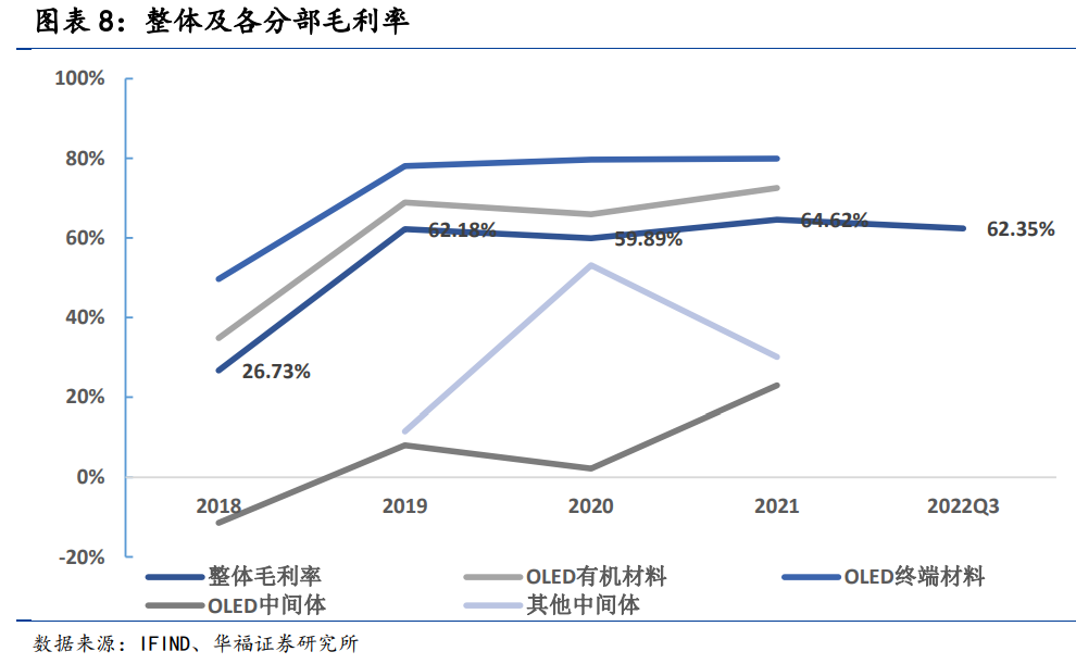 研报菌简评:公司OLED终端材料贡献主要营收及毛利,毛利占比超九成。