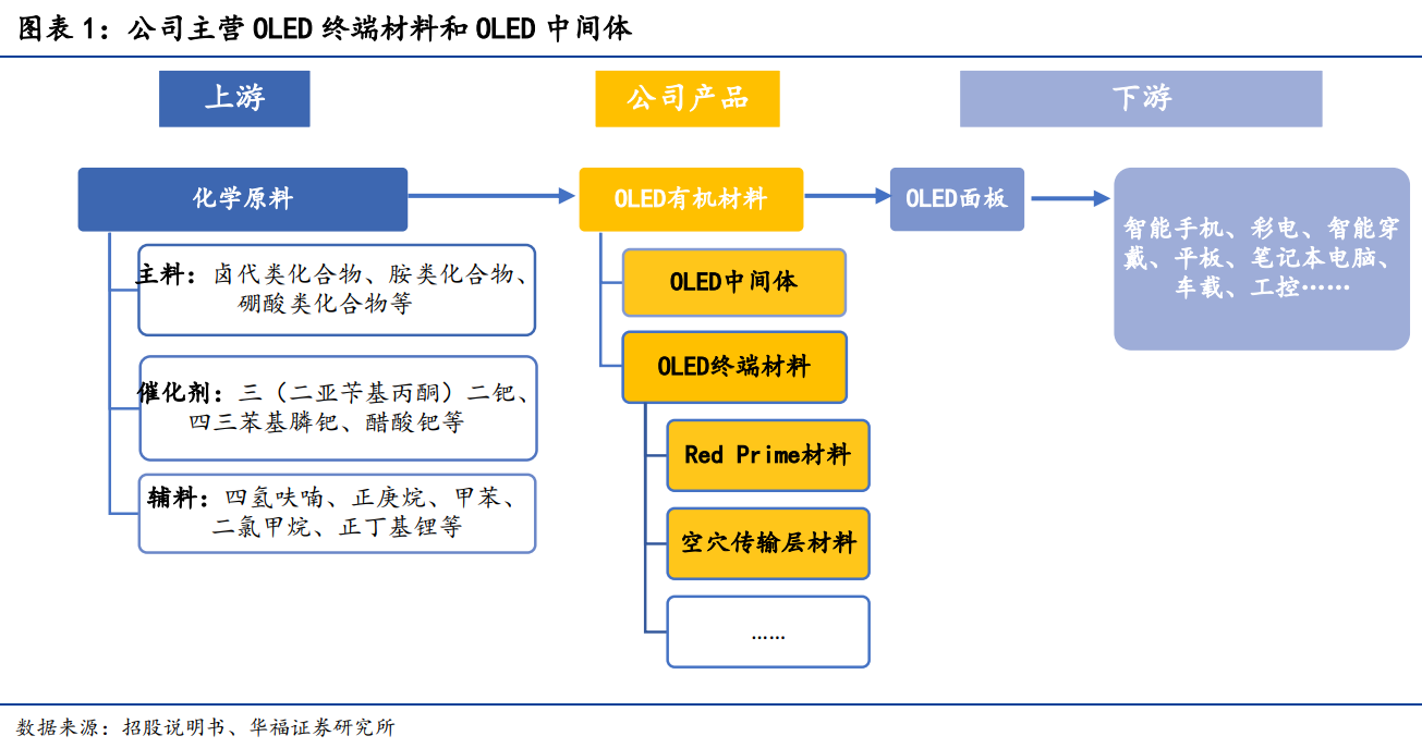 公司主要从事OLED有机材料的研发、生产和销售,是该行业的龙头,主营产品包括OLED中间体和OLED终端材料,上游为各种化学原料,经过合成反应形成OLED中间体,再经过合成、生华后形成OLED终端材料。直接下游为OLED面板,广泛应用于智能手机、彩电、智能穿戴、平板、笔记本电脑等电子领域。