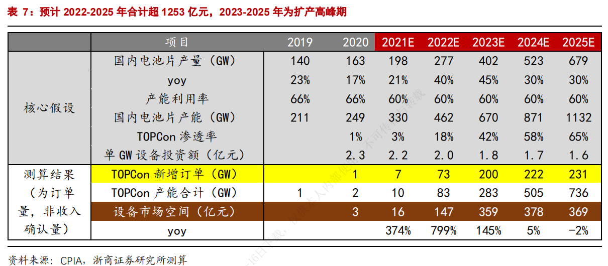 对TOPCon设备市场空间进行测算,假设全球电池片产量从2021年的198GW增长至2025年的679GW,产能利用率为60%;TOPCon电池在行业渗透率从2021年的3%提升至2025年的65%,机构预计2022-2025年设备市场空间合计超1253亿元。