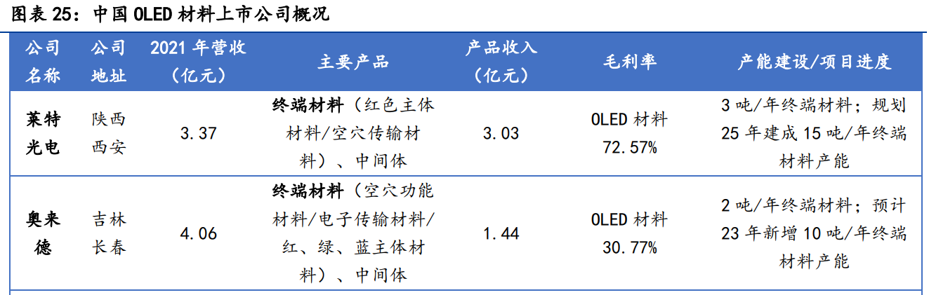 国内材料厂商集中在产业链上游,上市的终端材料企业仅有莱特光电和奥来德,从国内上市公司来看,终端材料,仅有奥来德、莱特光电两家实现批量供应,2021年OLED材料业务营收分别达到3.03亿元、1.44亿元,莱特光电销售OLED终端材料在收入、毛利率上均超过奥来德,在当前产能及未来规划产能上也更为领先。