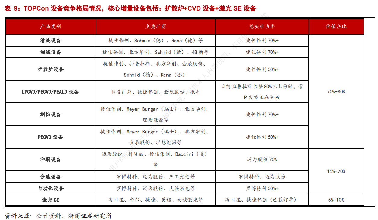 竞争格局方面,目前行业可谓是“百花齐放”、多技术路线设备共存。鉴于TOPCon设备相较传统PERC设备技术壁垒更高、成本优化空间更大,且核心增量设备增加了扩散炉、激光SE设备、LPCVD/PECVD设备。因此,未来也只有将设备做到极致的企业才能最终胜出,行业可能成为几家寡头垄断的竞争格局。