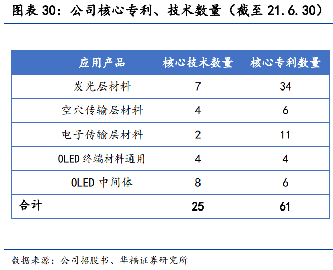 公司较早布局OLED材料领域,建立自有核心专利体系。截至今年6月30日,授权专利134项,累计申请的专利573项。核心专利覆盖了发光层材料、空穴传输层材料和电子传输层材料等,核心技术涵盖了OLED中间体合成、OLED升华前材料制备、OLED终端材料,形成了以终端材料为主,产业链完整的核心专利体系。
