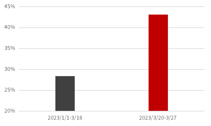 据中信证券统计,上周之前,TMT板块的日均成交额为2400亿元左右,占A股成交量的28.41%。而上周至今(3月20日至27日),板块的日均成交额则超4400亿元,全市场占比达到了43.13%。