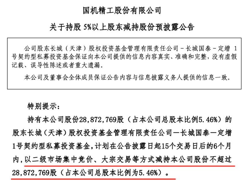 7月17日披露的公告显示,还有多家公司遭遇了股东的大额、连续减持。国机精工7月17日公告显示,持有公司2887万股的股东长城(天津)股权投资基金管理有限责任公司-长城国泰-定增1号契约型私募投资基金,计划减持公司股份不超过2887万股(占公司总股本比例为5.46%)。