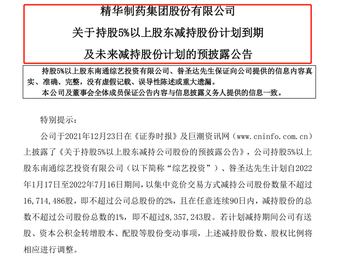 公告显示,精华制药股东南通综艺投资有限公司、昝圣达自今年1月17日至7月16日,共减持公司1628.4万股,占公司总股本的2%。截至目前,二者作为一致行动人,合计持有公司股份8.035%。因自身经营发展需要,精华制药上述两股东计划自今年8月8日至2023年2月4日,继续减持不超过1628.3万股,即不超过公司总股份的2%。