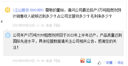 江山股份此前表示,公司年产3万吨TCPP阻燃剂项目已于上半年达产,产品质量达到国际先进水平。