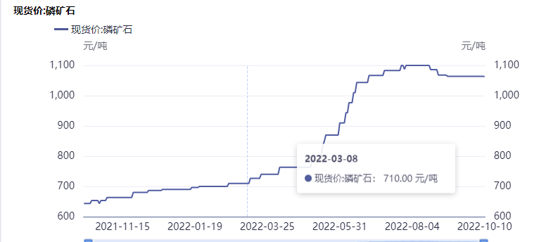 同花顺iFinD数据显示,截至10月10日,国内磷矿石价格已由年初的690元/吨上涨至1063.33元/吨。