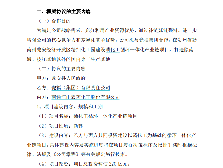 10月10日晚,江山股份发布公告,公司与贵州省瓮安县人民政府、瓮福集团签署《磷化工循环一体化产业链项目投资合作意向协议书》,该项目总投资暂估额达220亿元。
