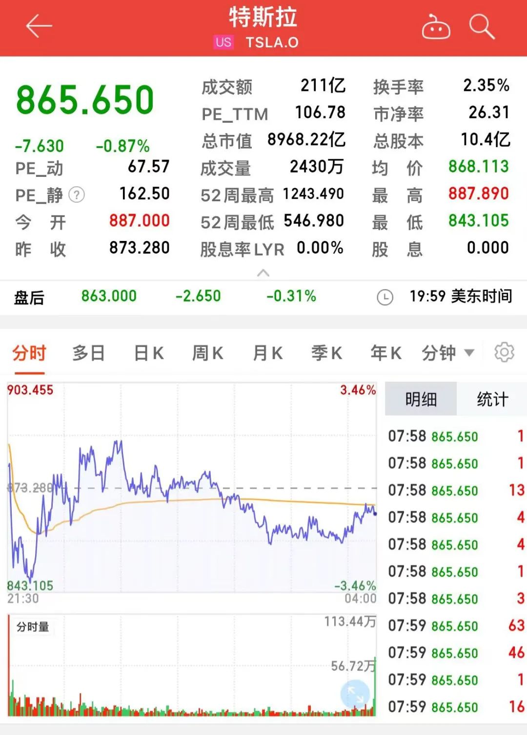 同花顺数据显示,截至美东时间5月6日收盘,特斯拉报收865.65美元/股,下跌0.87%,总市值为8968.22亿美元。
