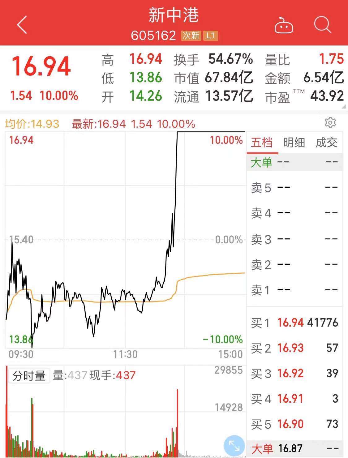 截至收盘,新中港报价16.94元/股,连收4个涨停板,总市值达到67.84亿元。盘后数据显示,今日主力净流出4686.52万元。
