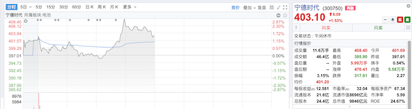 截至3月10日午间休盘,宁德时代股价重回400元以上,报403.1元,上涨1.53%,总市值为9846亿元。