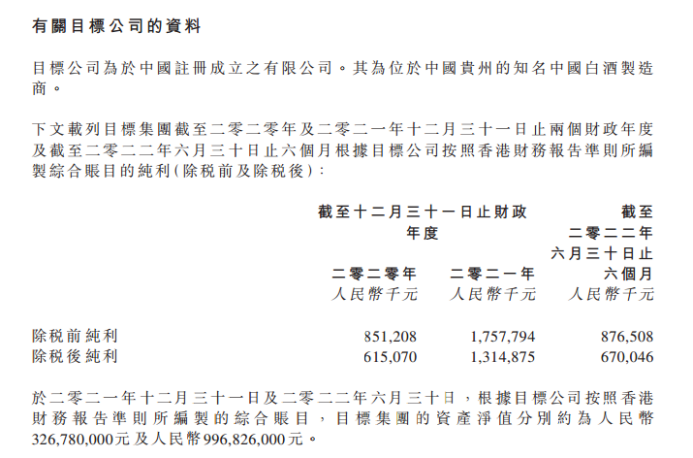 财务数据方面,2021年全年及今年上半年,金沙酒业除税后纯利分别约为13.1亿元及6.7亿元;资产净值分别分别为3.27亿元及9.97亿元。
