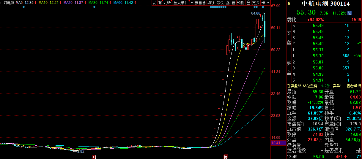 3月10日,中航电测午后大跌,截至发稿,报55.3元,跌11.32%,成交额37.02亿元。