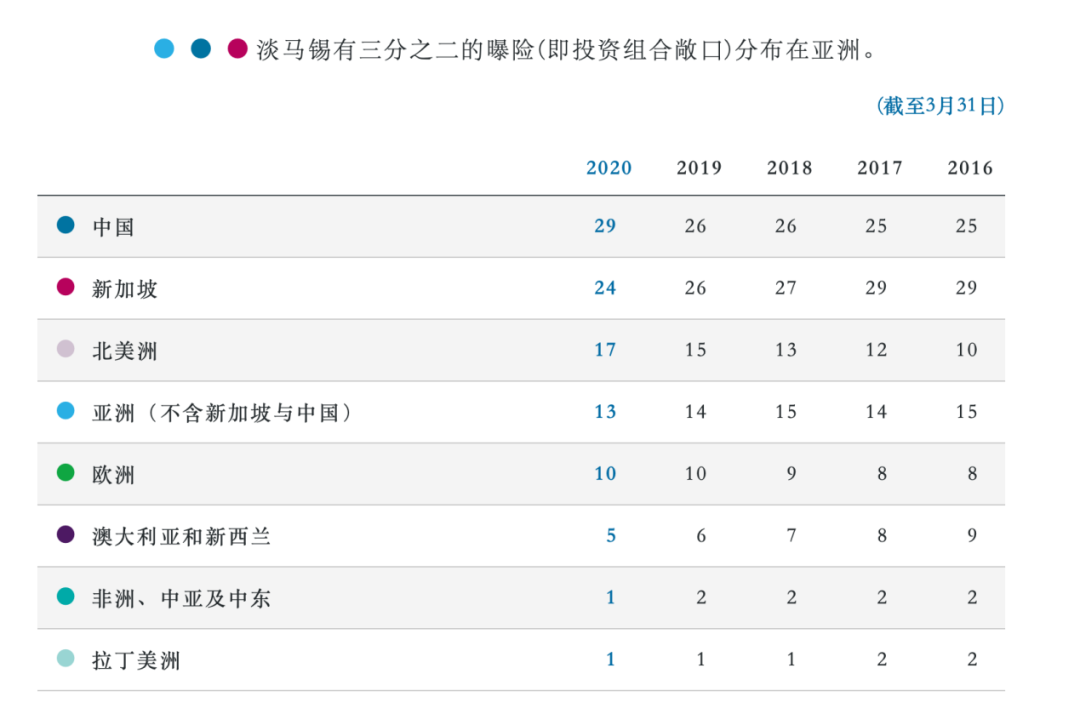 截至2020年3月的财报显示,淡马锡有29%的投资集中在中国,这一比例首次超过新加坡本土的24%。淡马锡中国区总裁吴亦兵在2020金融街论坛年会分论坛时表示,淡马锡在中国的投资占比升至29%,是非常了不起的成绩单。