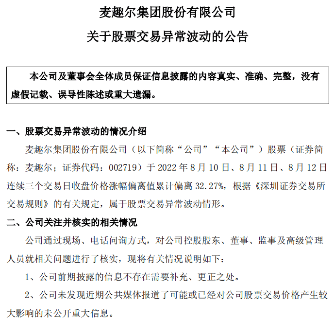8月14日晚间,麦趣尔发布股价异动公告称,经与公司控股股东、董监高核实,公司未发现近期公共媒体报道了可能或已经对公司股票交易价格产生较大影响的未公开重大信息。
