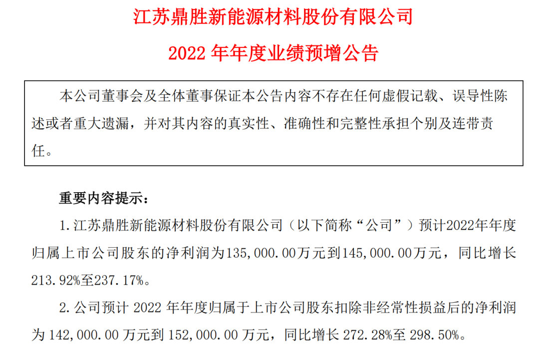 市场需求旺盛叠加产能加速释放,鼎胜新材2022年业绩大增。据业绩预告,公司2022年净利润为13.5亿元-14.5亿元,同比增长213.92%-237.17%。