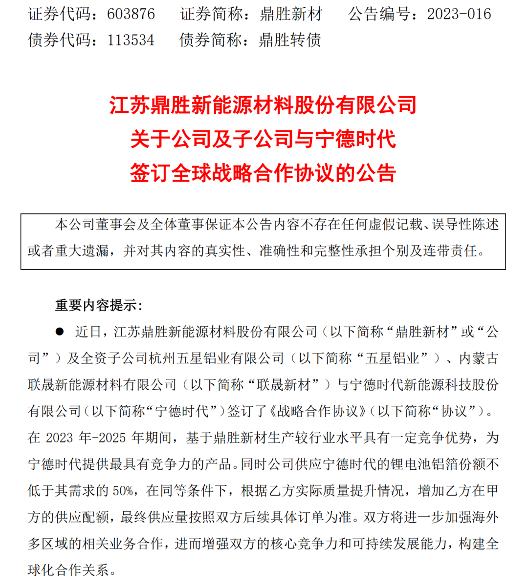 鼎胜新材表示,本次战略协议将进一步扩大供需合作,不过后续具体采购数量取决于宁德时代的需求情况、公司生产情况、产品价格的波动、原材料供应及双方未来合作等多种因素,最终以正式订单为准,对2023年度生产经营业绩不构成重大影响。