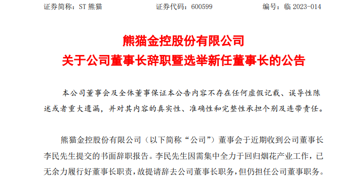 2月20日晚间,ST熊猫宣布,近期收到公司董事长李民提交的书面辞职报告。李民因需集中全力于回归烟花产业工作,已无余力履行好董事长职责,故提请辞去公司董事长职务,但仍担任公司董事职务。