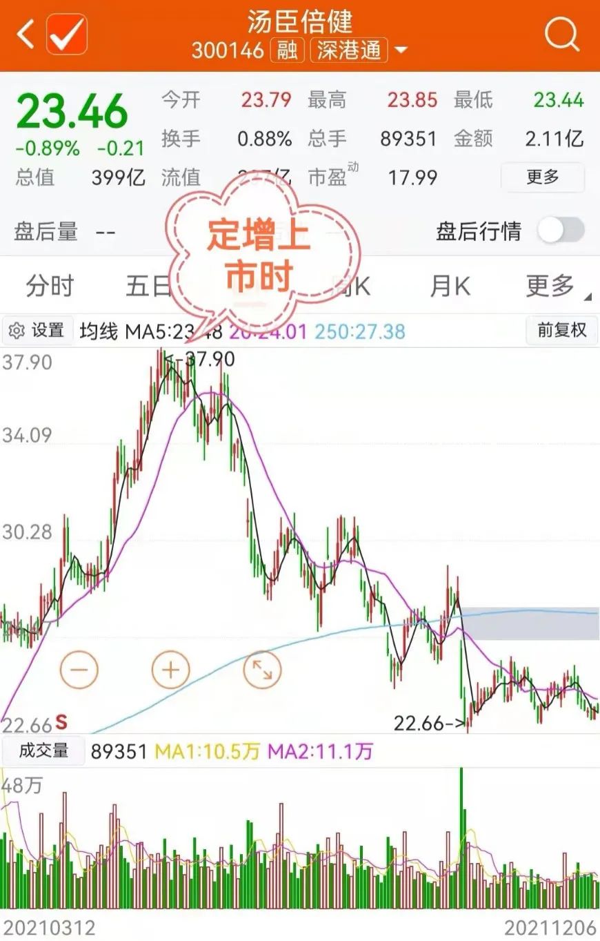 今年5月下旬,在汤臣倍健的增发中,超级牛散孙惠刚豪掷12亿元参与,当时股价超过35元,增发价为26.2元,安全垫超过30%。让他想不到的是,增发股份上市后不久,汤臣倍健股价就跌跌不休,尽管增发股份解禁了,孙惠刚却被套住了。