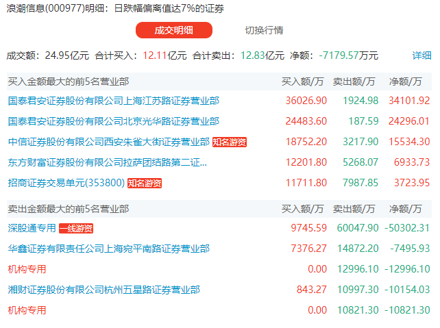 盘后的龙虎榜数据显示,知名营业部国泰君安证券上海江苏路及中信证券西安朱雀大街两家营业部分别大举净买入3.4亿及1.5亿。另外,被视为知名游资“炒股养家”所在席位的华鑫证券上海宛平南路营业部则在盘中做T,总体上净卖出近7500万。