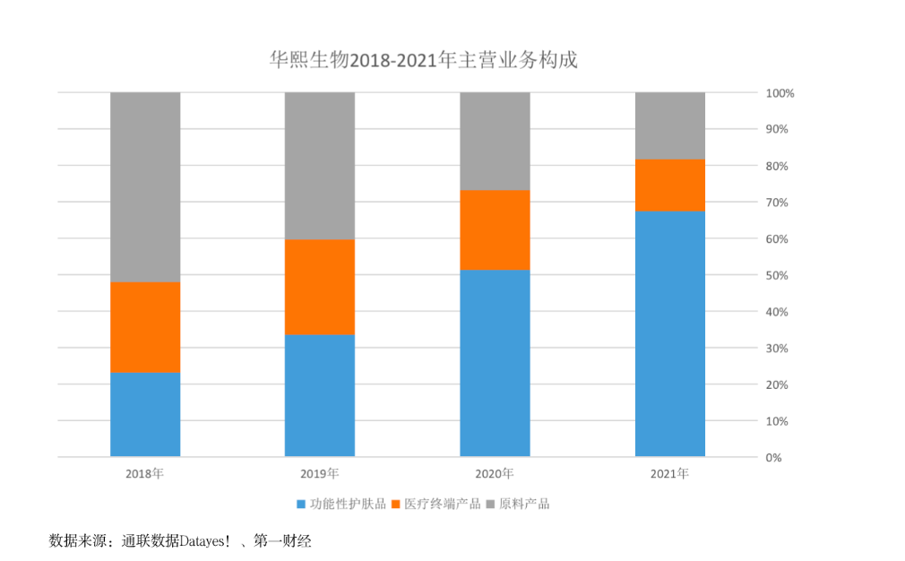 虽然如此,但这两年,随着原料市场饱和以及玻尿酸行业下游的火热,华熙生物的营收结构以逐步发生变化,功能性护肤品业务的营收占比从2018年的约23%增加至2021年的约67%,成为第一大业务,而原料产品的占比则在不断下降。