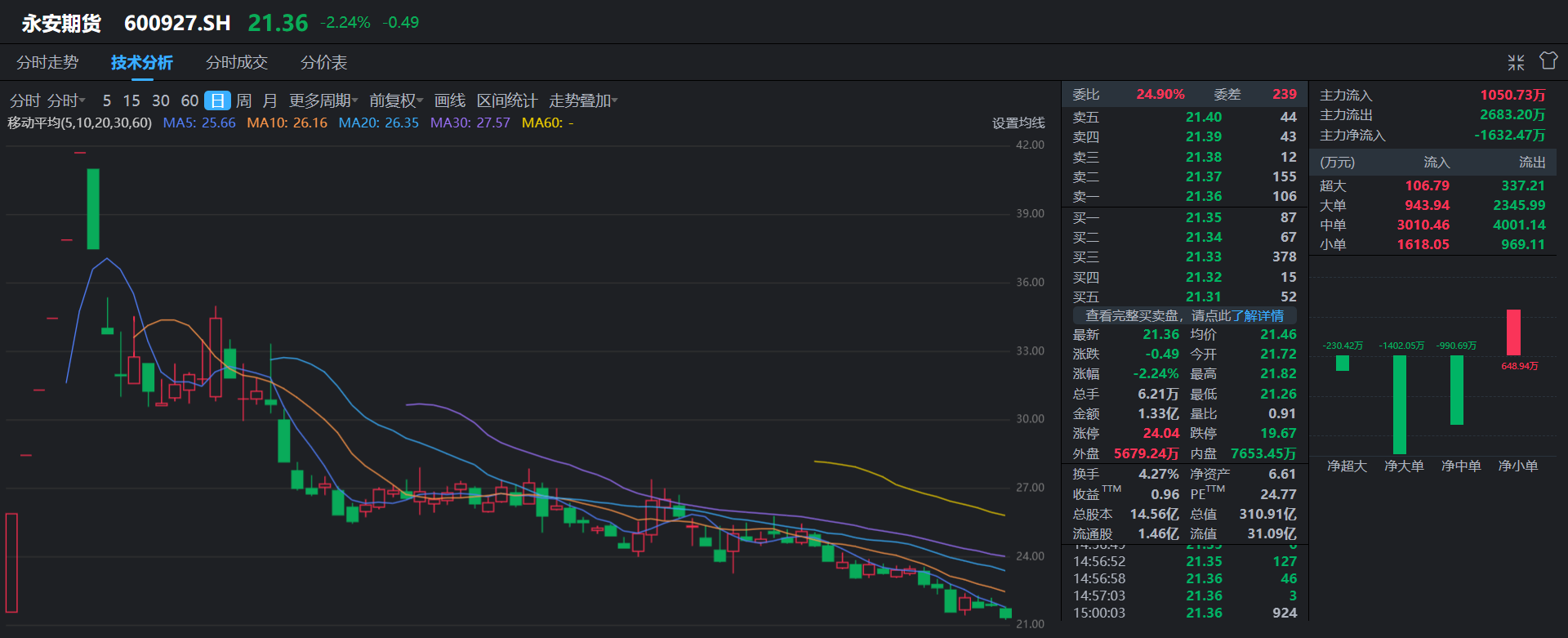 4月15日,永安期货(600927.SH)股价下跌逾2%,报收于21.36元/股,盘中最低下探至21.26元/股,创其上市以来新低。