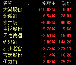 白酒概念板块早盘表现活跃 大湖股份涨停