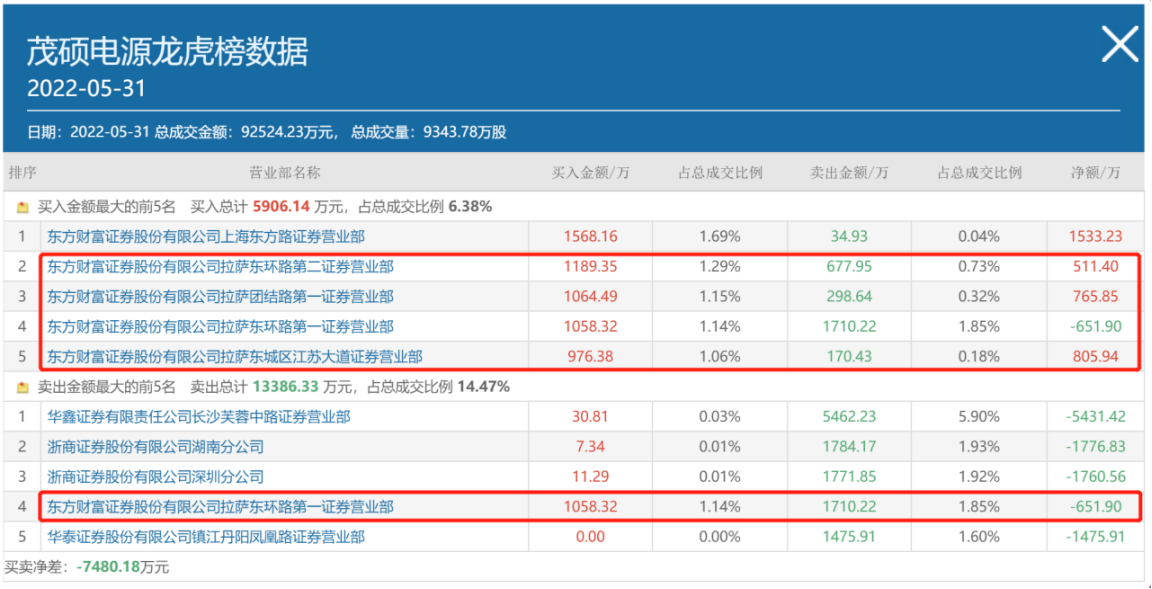背后是哪些资金在“兴风作浪”呢?茂硕电源盘后公布的一日榜数据显示,龙虎榜资金净卖出7480.18万元。有“散户大本营”之称的东方财富证券拉萨营业部包揽买二、买三、买四、买五及卖四席位。