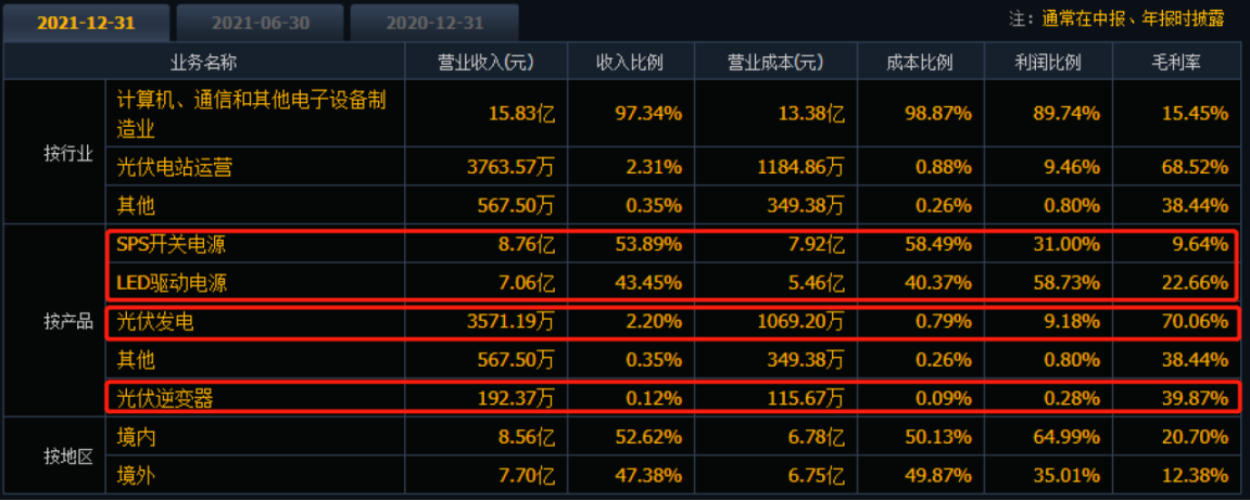 公开资料显示,茂硕电源主营业务为开关电源的研发、生产及销售,主要产品包括消费电子类电源和LED驱动电源。公司跨界下游光伏电站,2021年,茂硕电源在光伏发电和光伏逆变器板块的营收分别为3571万元、192.4万元,分别占总营收的2.2%和0.12%。