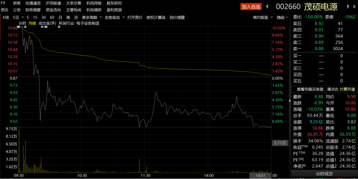 总市值不足25亿的茂硕电源开盘一字涨停,9:34炸板,随后形势急转直下,9:51触及跌停,屡次翘板但未翻红,尾盘封死跌停直至收盘,上演惊人的“天地板”一幕。