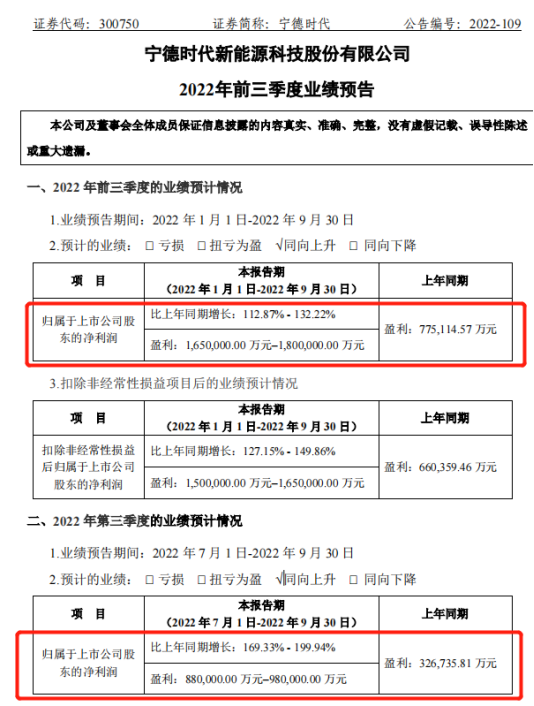 10月10日,宁德时代公告称,预计前三季度净利润165亿元至180亿元,同比增长112.87%至132.22%;预计第三季度净利润88亿元至98亿元,同比增长169.33%至199.94%。