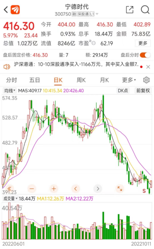 10月11日,宁德时代高开涨2.84%,盘中震荡走高,截至收盘,报416.30元,涨5.97%;总市值达1.02万亿,较昨日增572.05亿元;放量成交75.83亿元,日环比增67.21%。