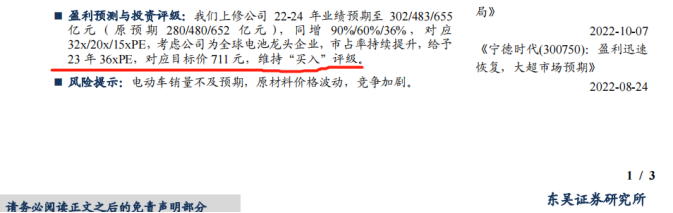东吴证券研究认为,公司三季度业绩超预期,上修公司2022-24年业绩预期至302亿元、483亿元、655亿元(原预期280亿元、480亿元、652亿元),同比增长90%、60%、36%,对应32x、20x、15xPE,考虑公司为全球电池龙头企业,市占率持续提升,给予23年36xPE,对应目标价711元,维持“买入”评级。