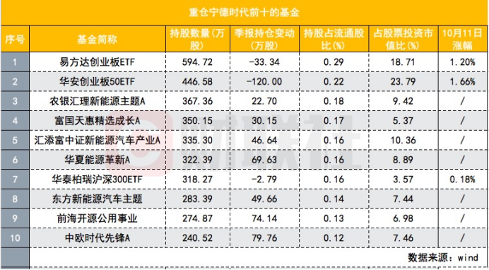 从持仓基金来看,易方达创业板ETF、华安创业板50ETF两只ETF基金持有宁德时代最多,分别达到594.72和446.68万股,权重也最大,持有市值占股票投资的18.71%和23.79%。从收益率来看,这两只基金近一年涨跌幅分别为-30.92%、-32.26%。