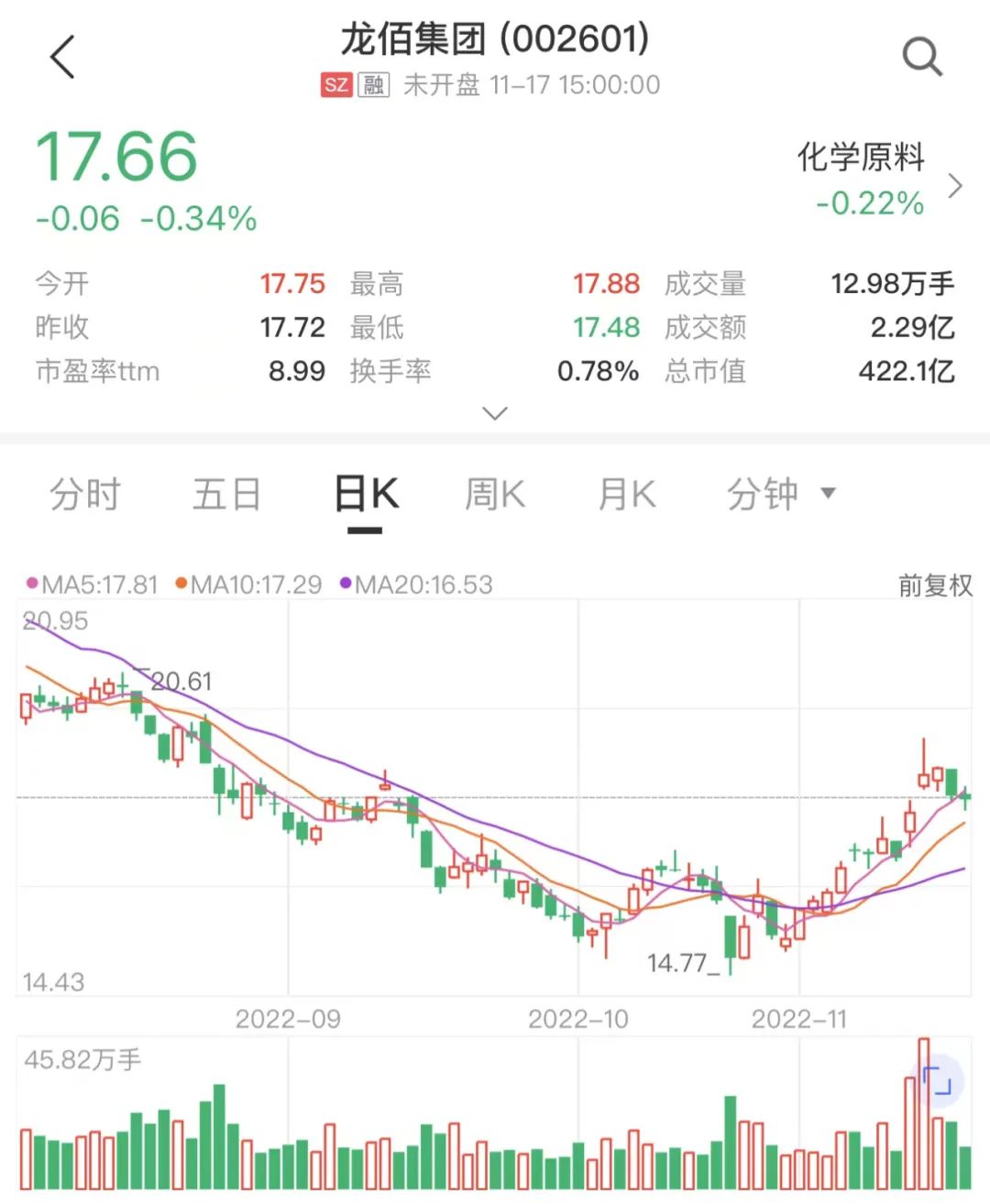 11月17日,龙佰集团股价收报17.66元/股,跌幅0.34%。