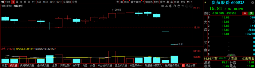 成飞集团借道上市最终花落中航电测,重组预期落空的贵航股份和成飞集成双双大跌。其中,贵航股份连续两个一字板跌停,截至收盘跌停板封单超19万手。