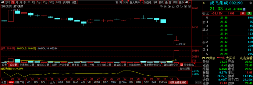 成飞集成继昨日一字板跌停后,今日开盘逼近跌停,随后出现反弹。截至收盘,股价收跌6.16%,全天成交额达8.45亿元,实际换手率高达22%。
