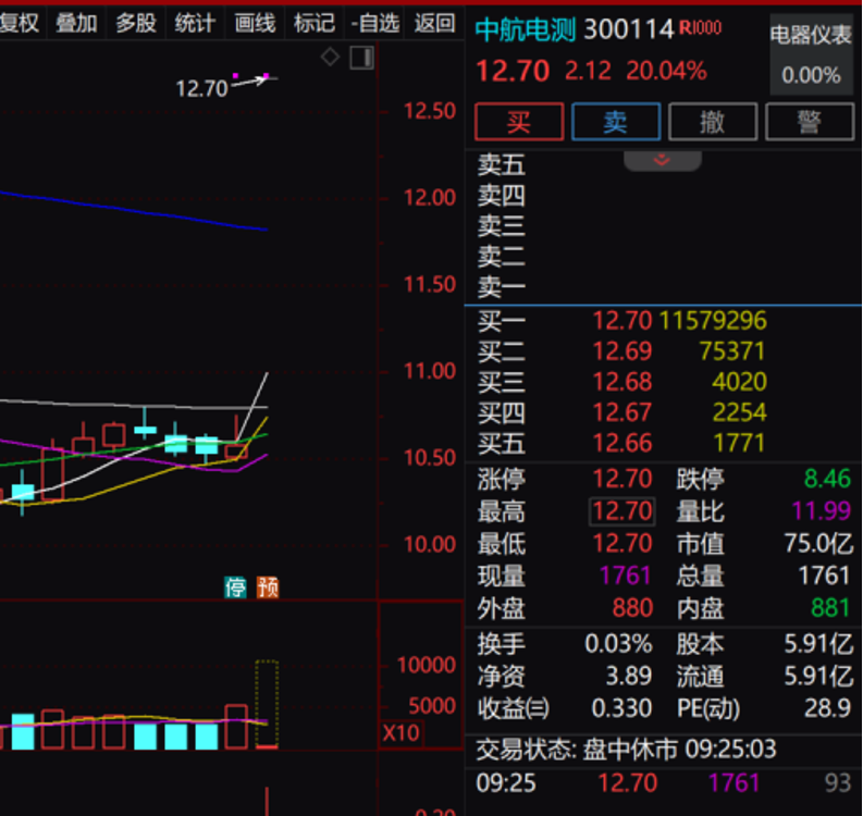 今日早盘中航电测表现亮眼,开盘20cm涨停,集合竞价结束后封单高达1158万手,接近流通盘的两倍,买盘资金接近150亿元。截至上午收盘,该股封单依然超过718万手。